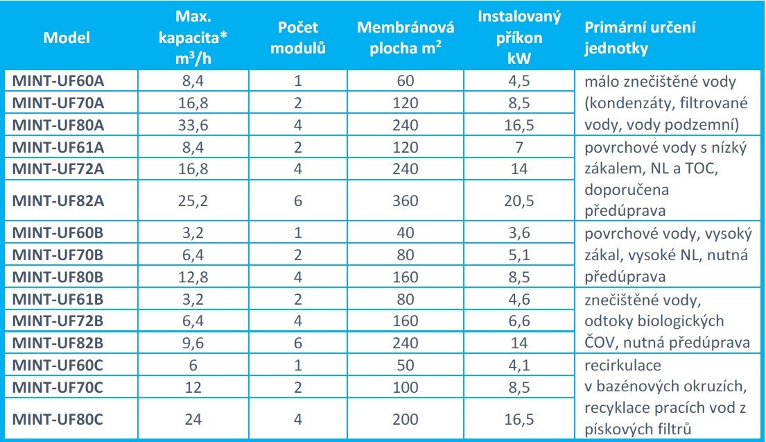 Kapacitní řada ultrafiltračních jednotek MINT-UF spojuje inteligentní design s inteligentním řízením procesu filtrace. Modulární systém rámů jednotky umožňuje jednoduché rozšiřování jednotek o doplňky v návaznosti na požadavky konkrétní aplikace a klienta. Aplikace samoučícího SW zajišťuje maximální výtěžnost (recovery) a bezpečnost provozu. Hlavními rysy inteligentních membránových jednotek MINT-UF je:
